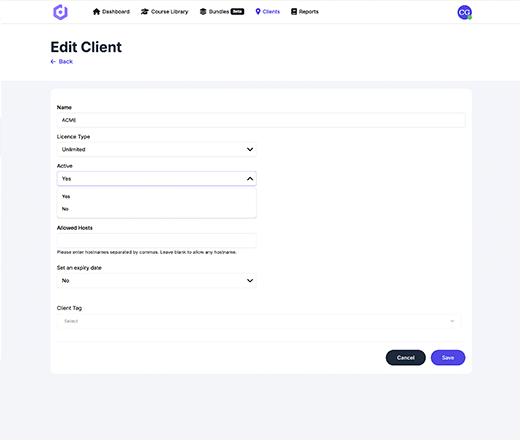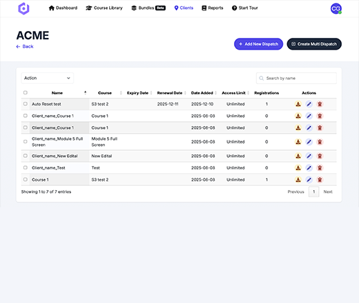 Each deployment generates a unique link per client, allowing you to set learner limits and expiration dates, configure registration and tracking options, and use customizable postback URLs to sync data back to your own systems.