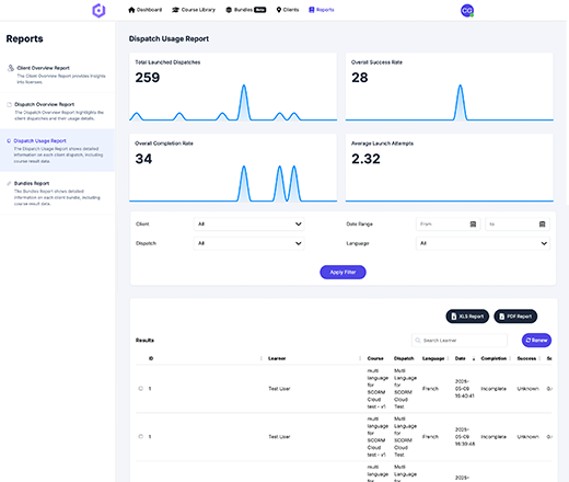 Get full visibility into how your content is being used with real-time analytics, completion and score tracking, client-level reporting, and easy data exports for compliance and auditing needs.